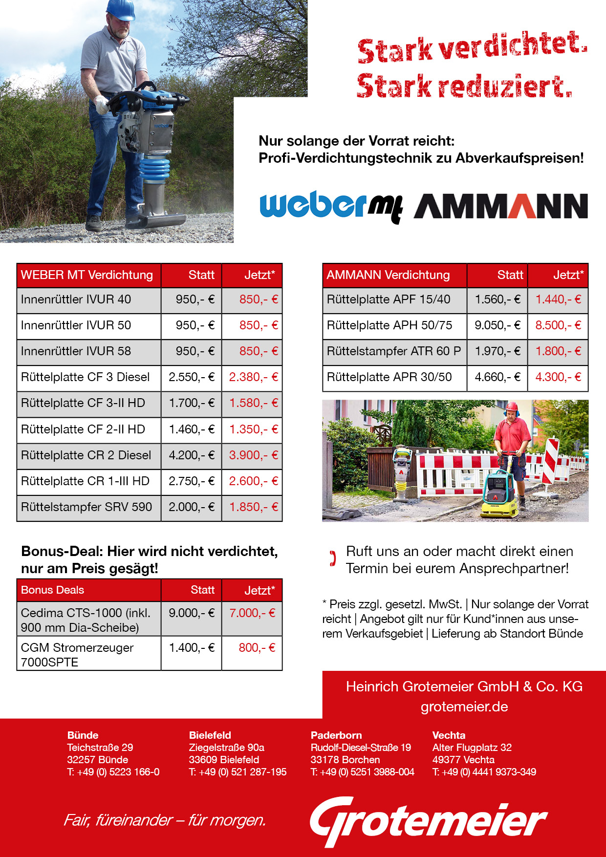 Ob Rüttelplatten, Rüttelstampfer oder Innenrüttler – bei dieser Abverkaufsaktion findest du leistungsstarke Maschinen von Ammann und Weber MT, die genau das liefern, was auf der Baustelle zählt: Zuverlässigkeit, Power und Langlebigkeit.