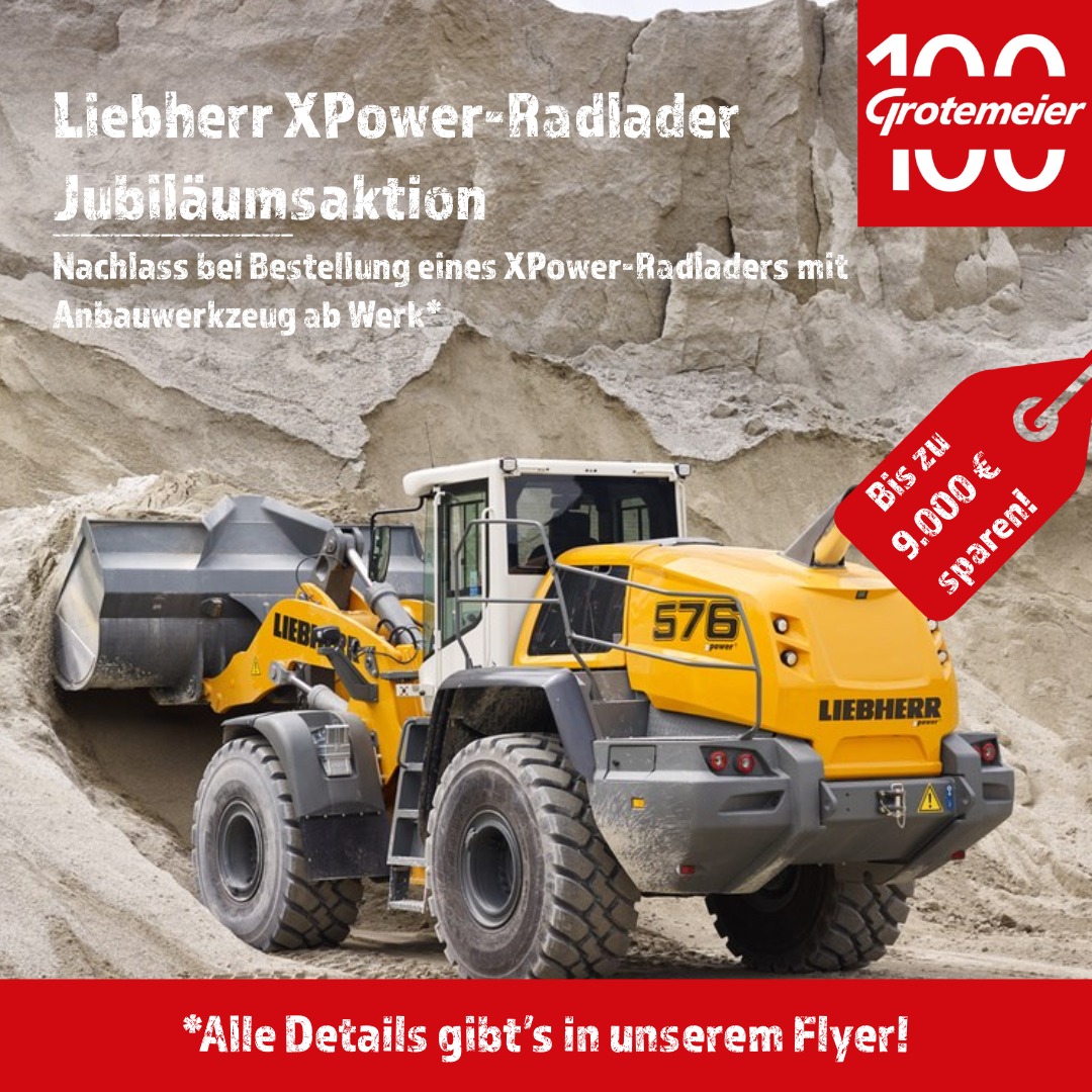 *Gültig bis 30.06.2026 für alle XPower-Radlader (ausgenommen L 580 LogHandler XPower). Voraussetzung ist der Bestelleingang im genannten Zeitraum. Limitierte Stückzahl, solange der Vorrat reicht. Alle Preise zzgl. gesetzlicher MwSt. Angebot nur für gewerbliche Interessenten. Nicht kombinierbar mit anderen Aktionen. Irrtümer vorbehalten. Es gelten unsere AGB unter grotemeier.de.