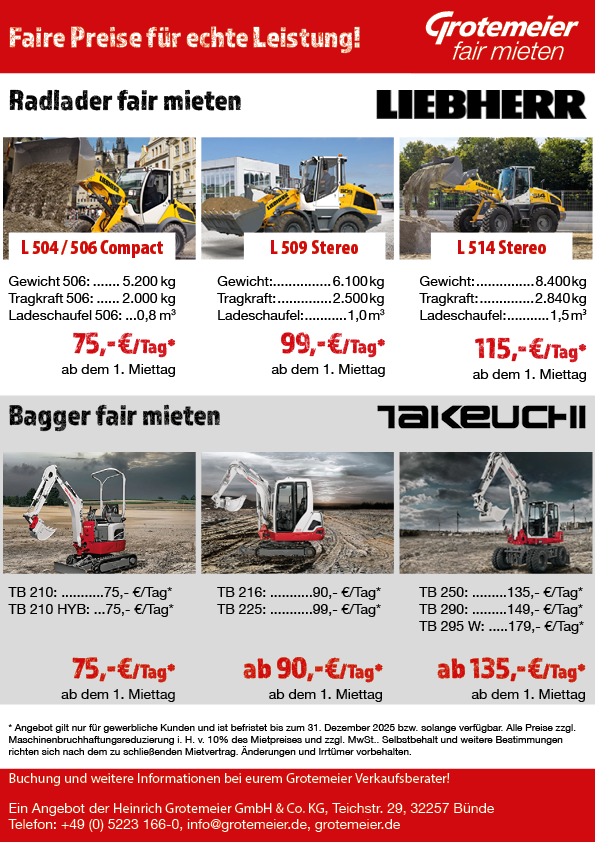 * Angebot gilt nur für gewerbliche Kunden und ist befristet bis zum 31. Dezember 2025 bzw. solange verfügbar. Alle Preise zzgl. Maschinenbruchhaftungsreduzierung i. H. v. 10% des Mietpreises und zzgl. MwSt.. Selbstbehalt und weitere Bestimmungen richten sich nach dem zu schließenden Mietvertrag. Änderungen und Irrtümer vorbehalten.